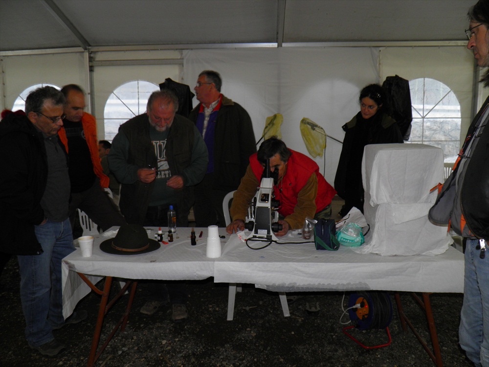 Ο Άγγελος με τον Γιώργο, προσπαθούνε να ταυτοποιήσουνε κάποια μανιτάρια που μόλις φθάσανε από τον Χολωμόντα, τα έφερε ο Πρόεδρος των Μανιταρόφιλων Θεσσαλονίκης, Δημήτρης Βολοβότσης.